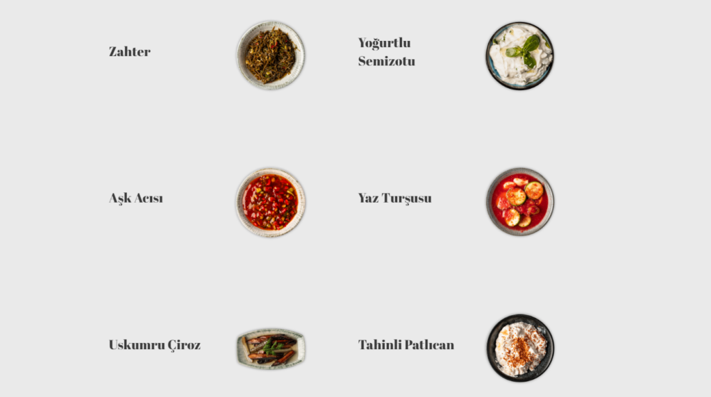- Babagannuş: Kızartılmış veya közlenmiş patlıcanın ezilmesiyle yapılan bir meze.